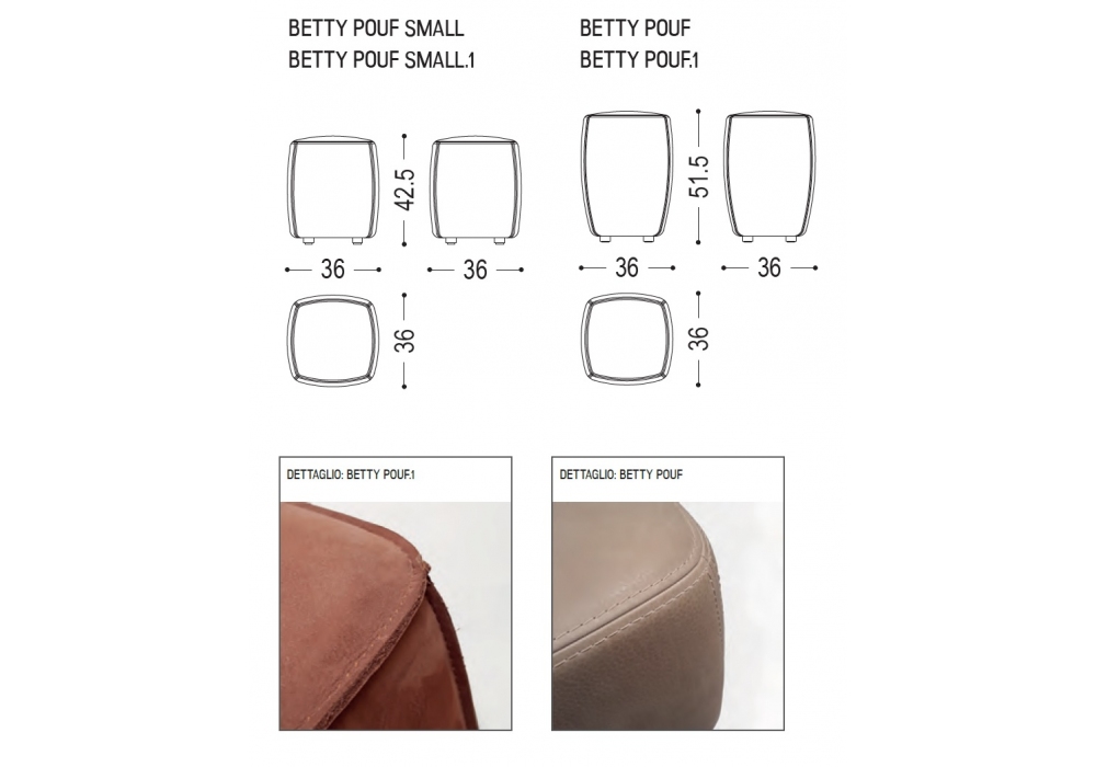 | Dimensions | Betty Pouf Small_ 36 x 36 x H 42.5 cm; Betty Pouf_ 36 x 36 x H 51.5 cm. |