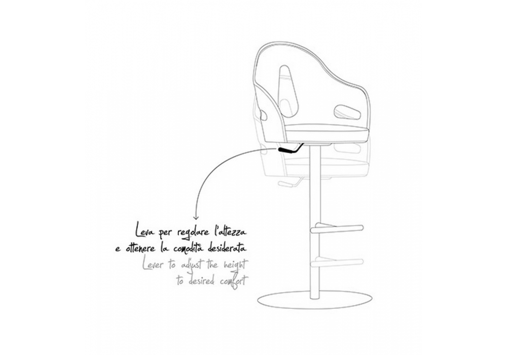 Dora is a swivel bar stool designed by Massimo Scolari for Giorgetti.Bar stool with adjustable height thanks to a spring mechanism, with base structure in satinfinished steel. The structure of the seat is in multilayer and the padding is in multi-density expanded polyurethane. The structure of the backrest is in curved aluminium. The covering is in saddle leather, which is available in different colours while the backrest can be matched to different shades of piping.