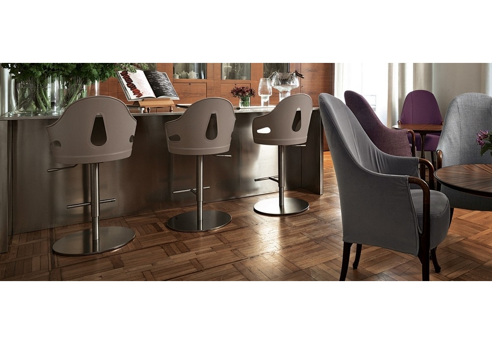 Dora is a swivel bar stool designed by Massimo Scolari for Giorgetti.Bar stool with adjustable height thanks to a spring mechanism, with base structure in satinfinished steel. The structure of the seat is in multilayer and the padding is in multi-density expanded polyurethane. The structure of the backrest is in curved aluminium.