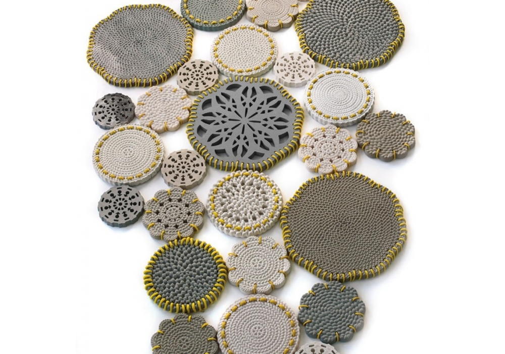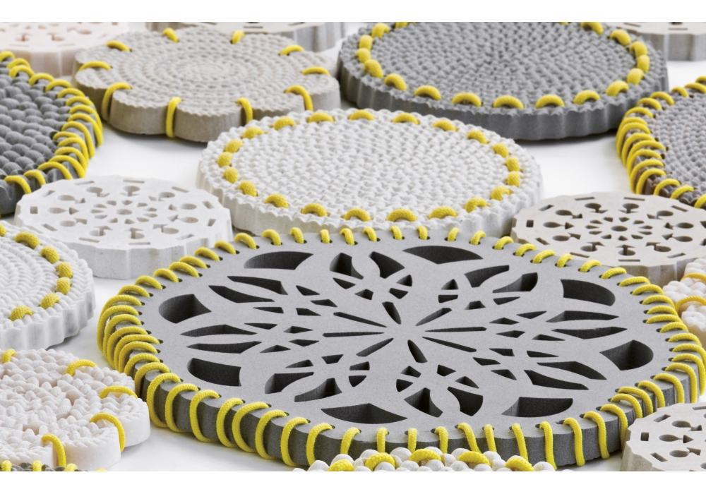 Nat|f|Use conçu par Patricia Urquiola pour Budri est un tapis composé par dentelles de marbre et de calcaire reliées par une bande jaune fluo. Disponible aussi en 2 dimensions.