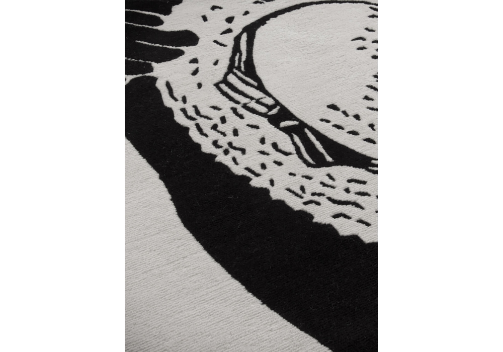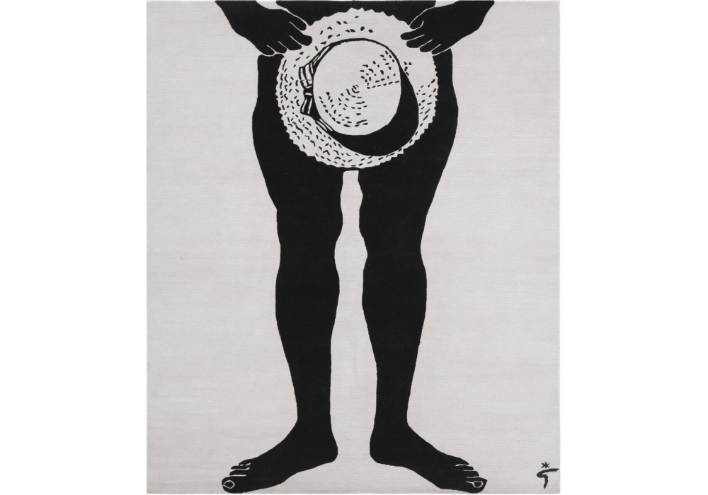 Cap conçu par René Gruau pour Amini est un tapis noué main 100% laine néo-zélandaise avec des franges tournées dans le dos et recouvertes de tissu.