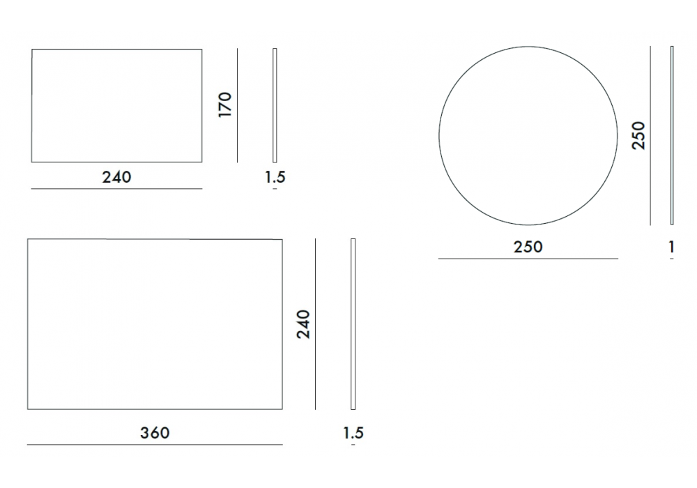 | Dimensions | 240 x 170 cm; 360 x 240 cm; Ø 250 cm. |