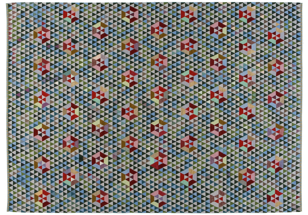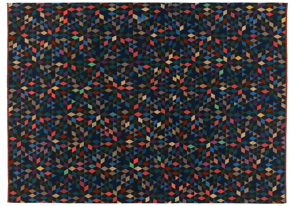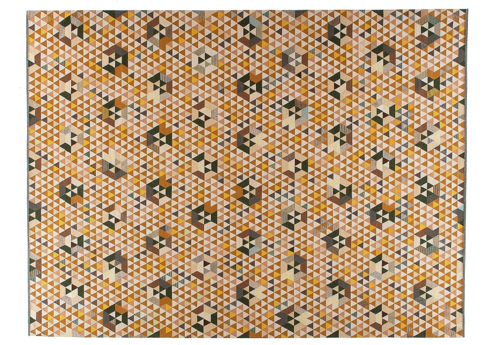 Triangles conçu par Bertjan Pot pour Golran est un tapis tissé à plat noué à la main selon la technique KILIM. Il est composé de 70% de laine, 15% de soie et 15% de fibres de cactus.