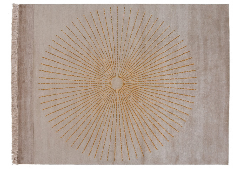 Irradia conçu par Gamfratesi pour Golran est un tapis rectangulaire caractérisé par une douce structure en laine et soie nouée à la main avec un motif métallique précis et graphique.