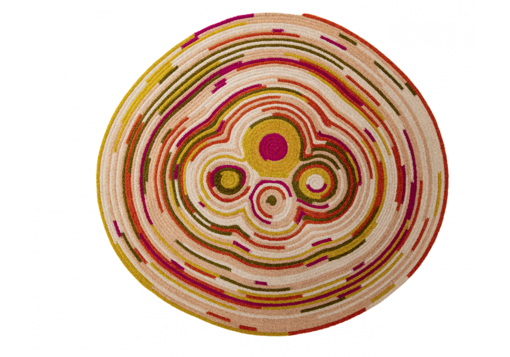 Joy conçu par CRS pour Paola Lenti, est un tapis réalisé en cousant un cordon bouclé au point zigzag. Son centre est composé de quatre formes circulaires de dimensions et de couleurs différentes.