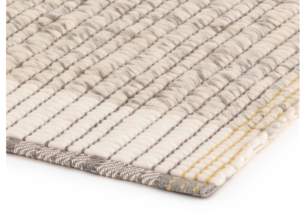 Reversible Yellow conçu par Charlotte Lancelot pour Gan est un tapis réalisé en combinant des fils d'épaisseurs et de matières différentes : 100 % laine vierge d'un côté et lin de l'autre.
