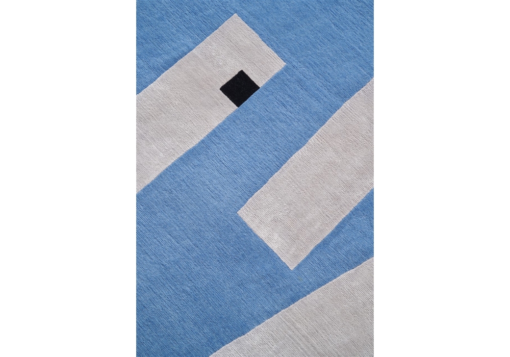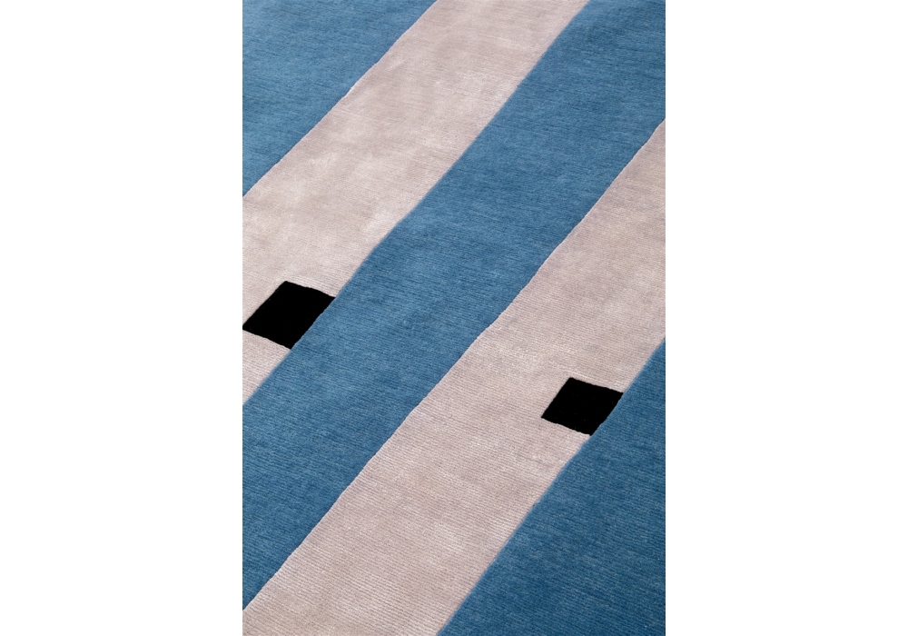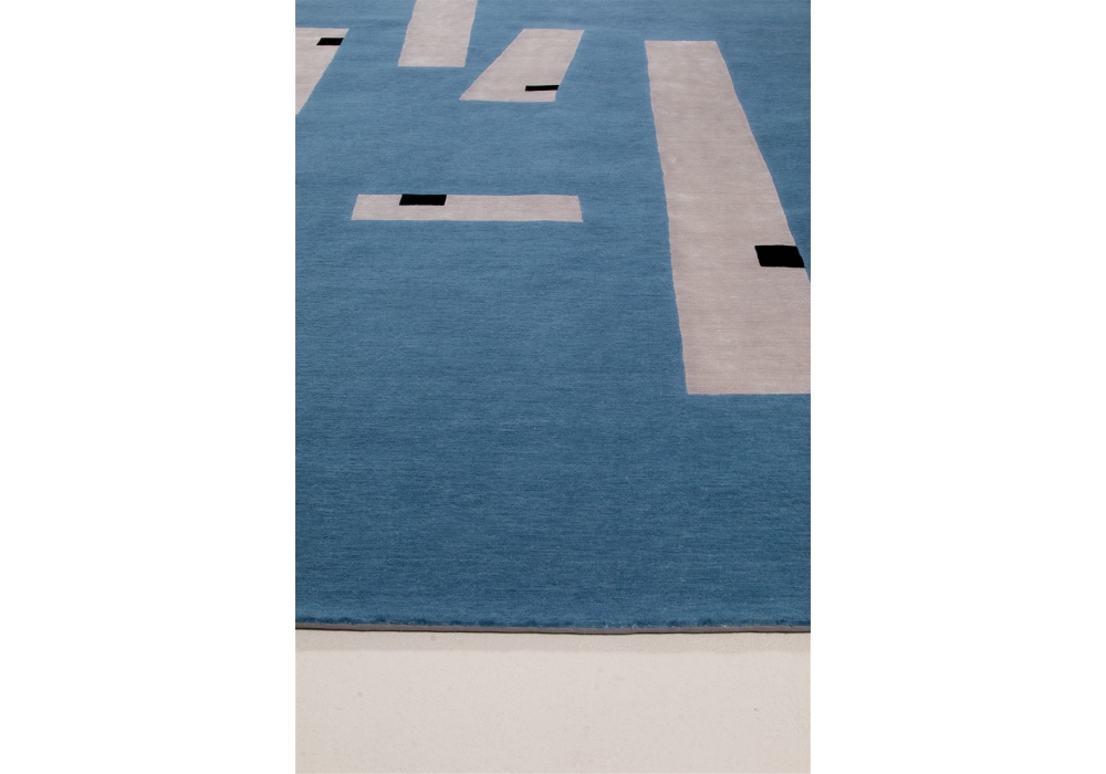 Macchine Inutili Azur, conçu par Bruno Munari pour Amini, est un tapis noué à la main, composé à 80 % de laine tibétaine filée et cardée à la main et à 20 % de soie pure. Proposé en deux dimensions, il est destiné exclusivement à un usage intérieur.