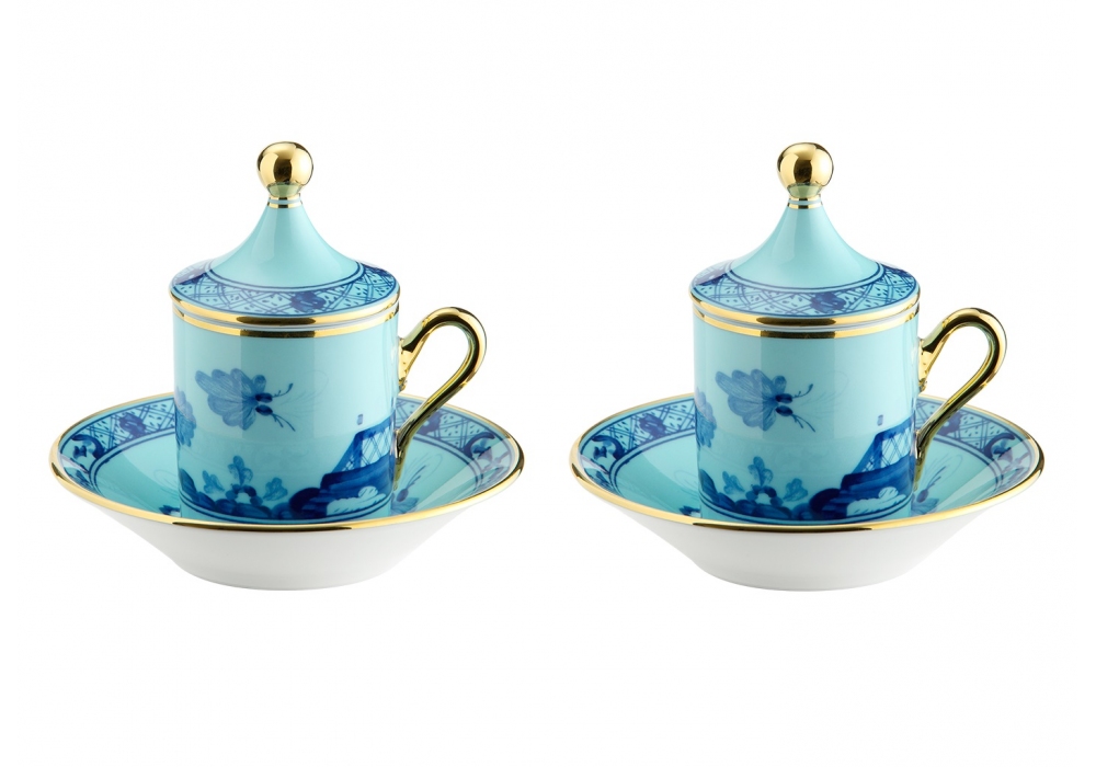 Tazza Caffè con Piatto e Coperchio Oriente Italiano Iris conçue par Ginori 1735 est un jeu de 2 tasses de café décorées. Avec soucoupe et couvercle.