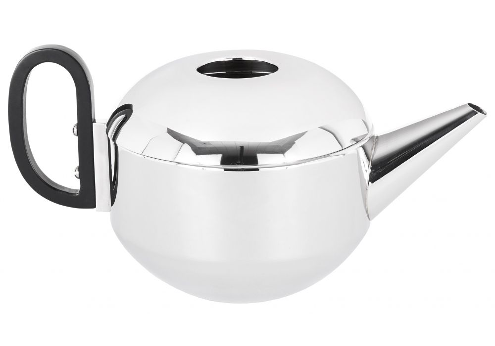 Form conçue par Tom Dixon est une théière ronde en acier inoxydable avec une finition argentée brillante.