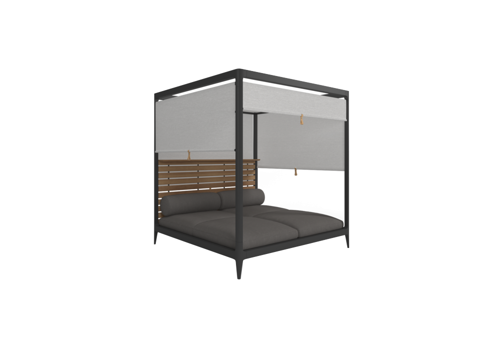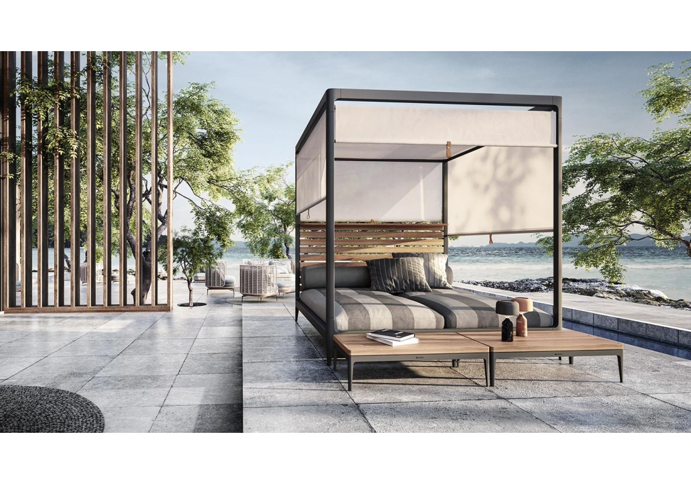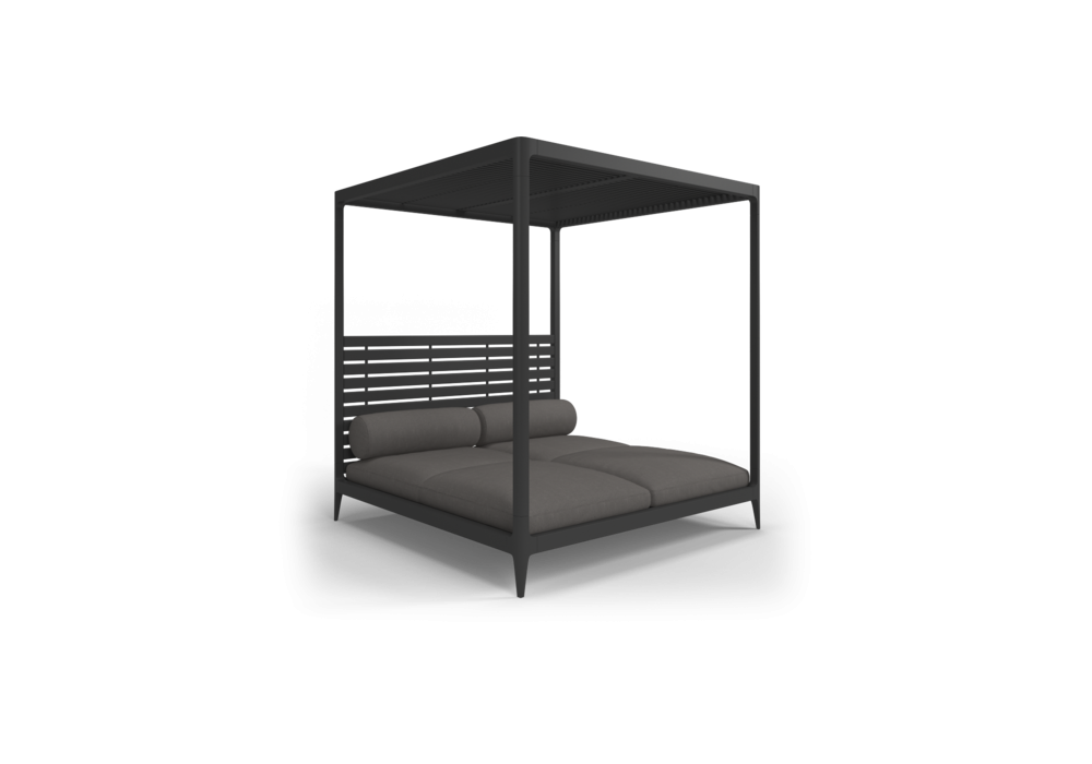 Grid conçu par Henrik Pedersen pour Gloster est un cabanon composé d'une structure en aluminium thermolaqué, d'un panneau arrière en lattes de teck avec une finition naturelle ou de lattes d'aluminium thermolaqué, et de coussins d'assise et de dossier recouverts de tissu d'extérieur.