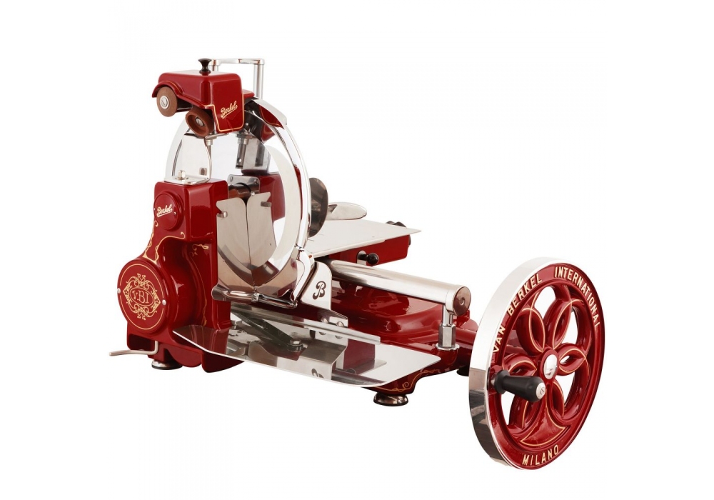 Volano B114 conçue par Berkel est une trancheuse en acier. Disponible également en 2 finitions: rouge ou noir. Sur demande, le piédestal est disponible comme accessoire.