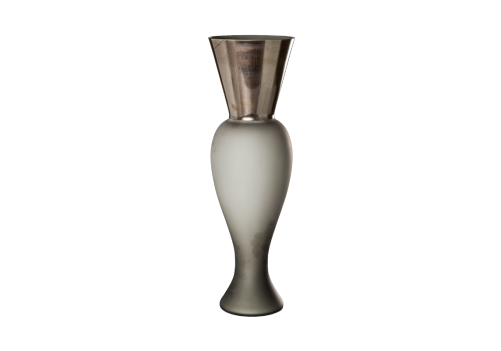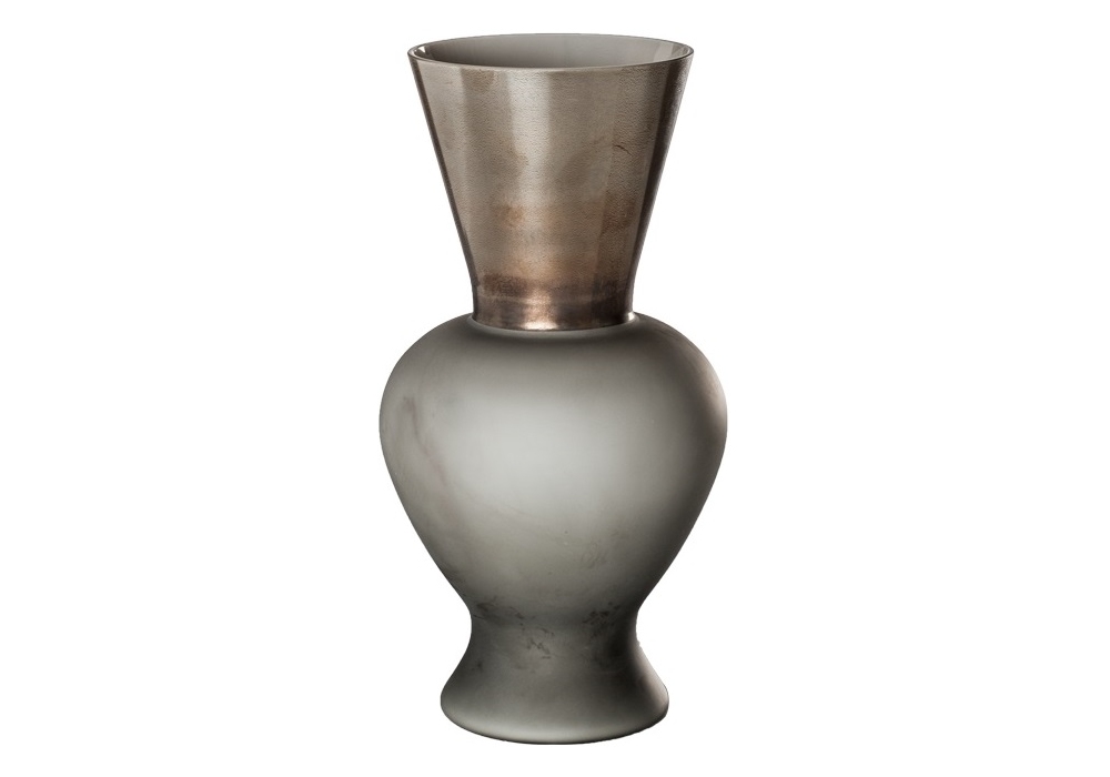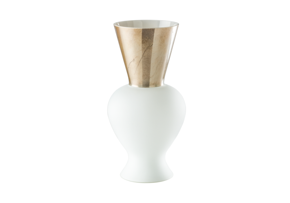 Re Regina & Principe conçu par Rodolfo Dordoni pour Venini est un vase en verre soufflé à la main. La partie supérieure, la couronne, est recouverte de feuilles métalliques. Disponible en différentes tailles et finitions.