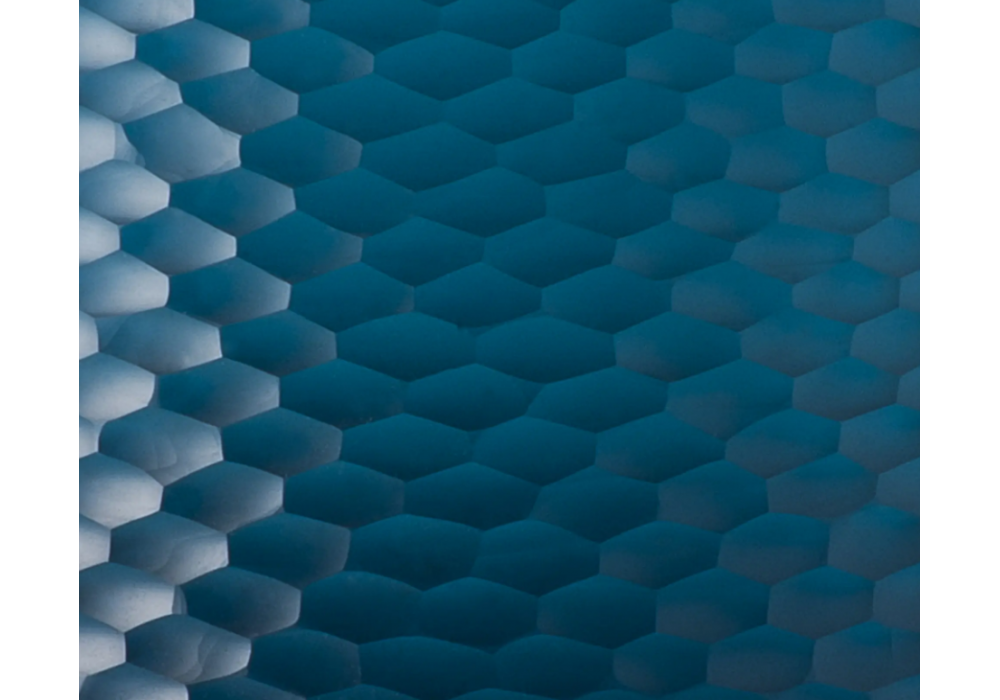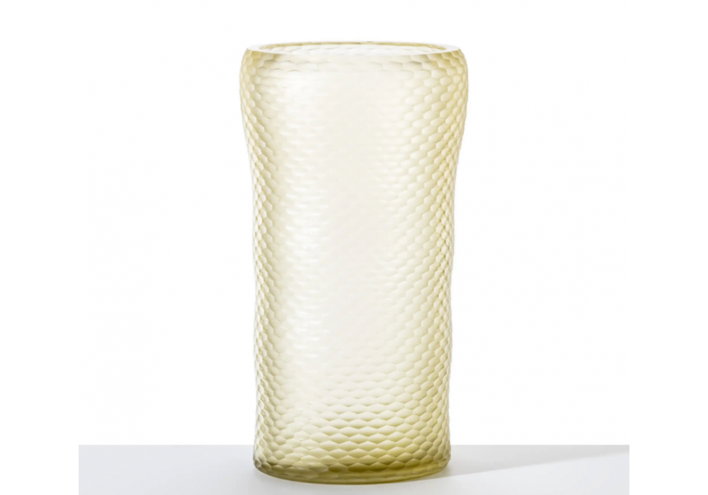 Battuto A Nido D'Ape conçu par Carlo Scarpa pour Venini est un vase en verre épais soufflé à la bouche, fini avec de profonds biseaux en nid d'abeille irréguliers. Edition numérotée par année.