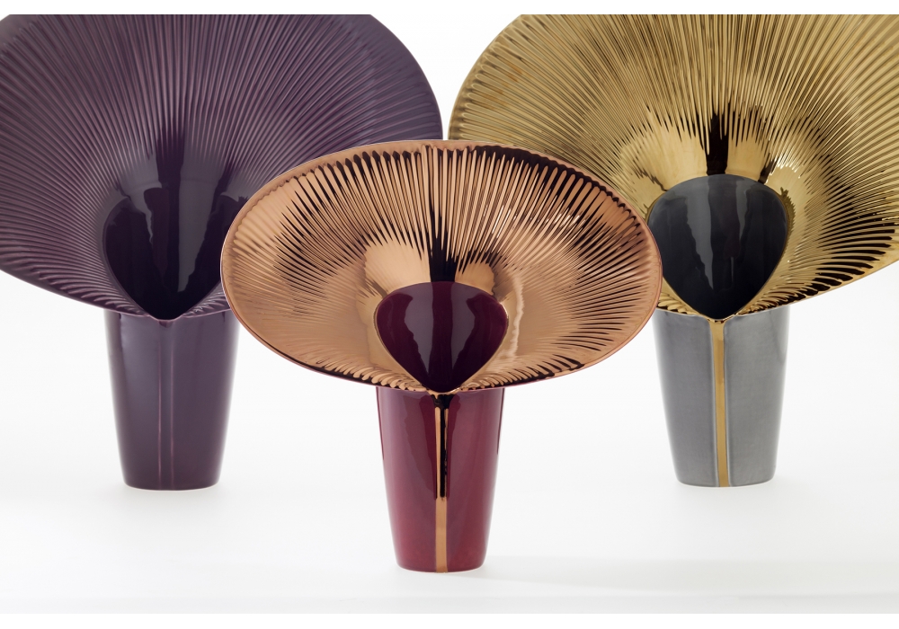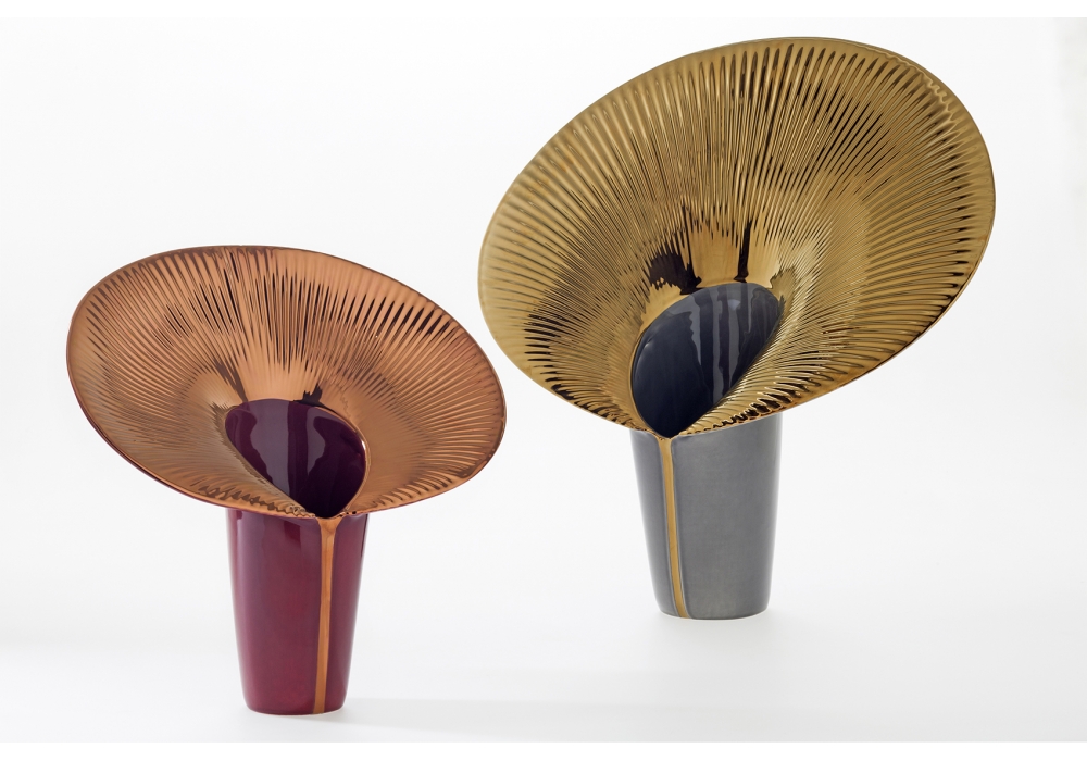 Fusca conçue par Constance Guisset pour Bosa est une collection de vases en céramique émaillée et métaux précieux. Disponible en deux dimensions différentes.