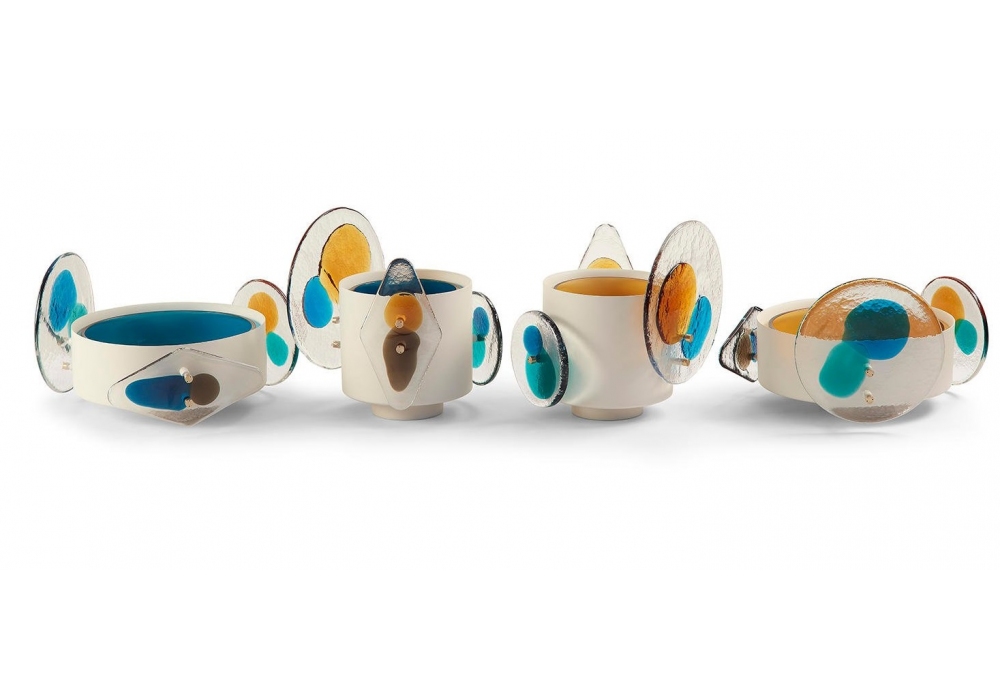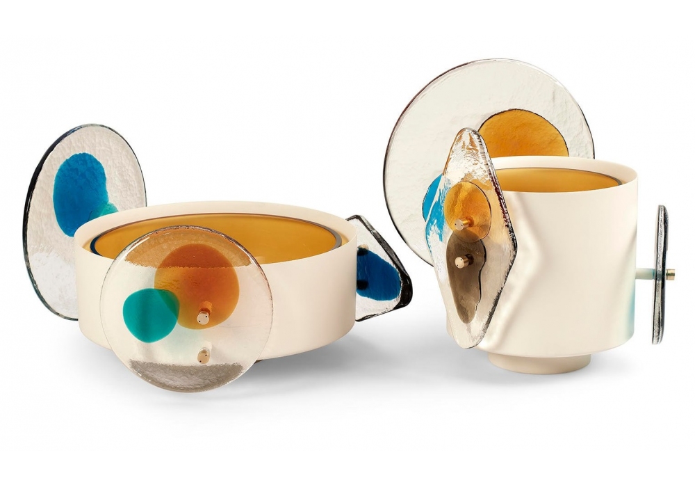 Colourdisc 797 conçue par Bethan Laura Wood & Venini pour Cassina est une collection de vases en laiton peint avec des éléments décoratifs en verre de Murano coloré. Vase interne en verre inclus. Disponible en différentes finitions et dimensions.
