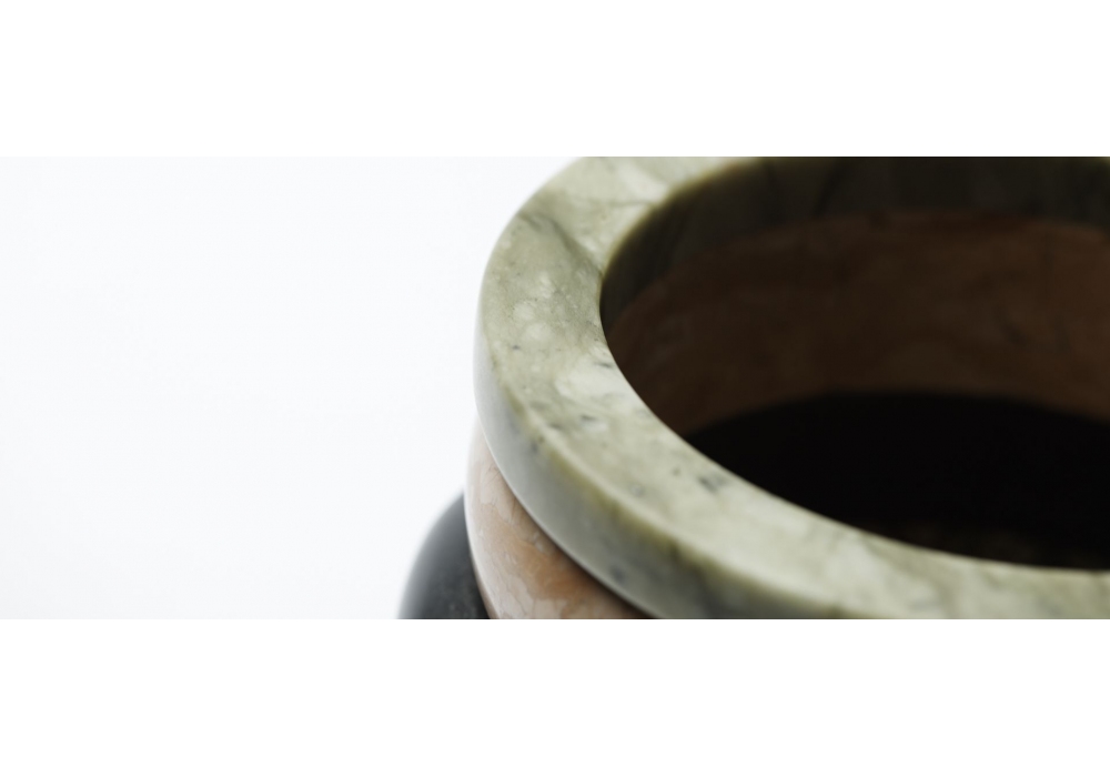 Lollo conçu par Cristina Celestino pour Budri est un vase composé de bracelets de différentes couleurs et formes, réalisés en Nero Assoluto, Verde Ming, Rain Forest Green, Giallo Noce et Onice Miele.
