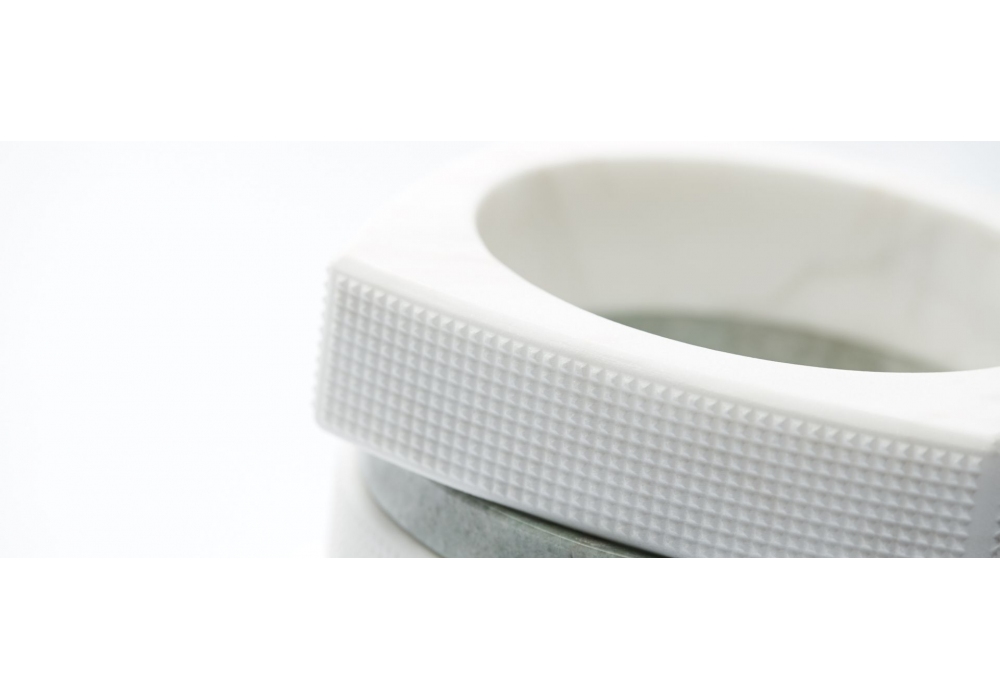 Rita conçu par Cristina Celestino pour Budri est un vase en Carrare Blanc et Quartzite Vert composé de quatre bracelets de formes différentes. La texture moletée rend les premier et troisième bracelets particulièrement précieux.