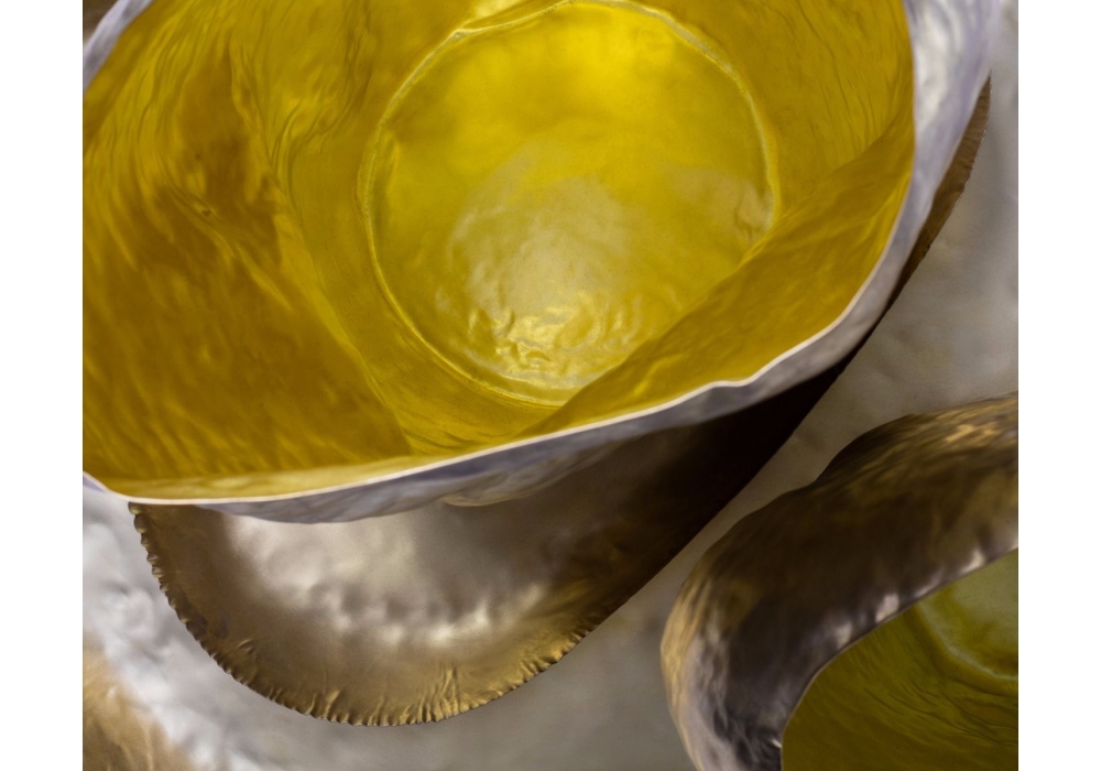Bash Wide conçu par Tom Dixon est un vase en laiton plaqué or fait main. Chaque pièce est unique dans sa forme.