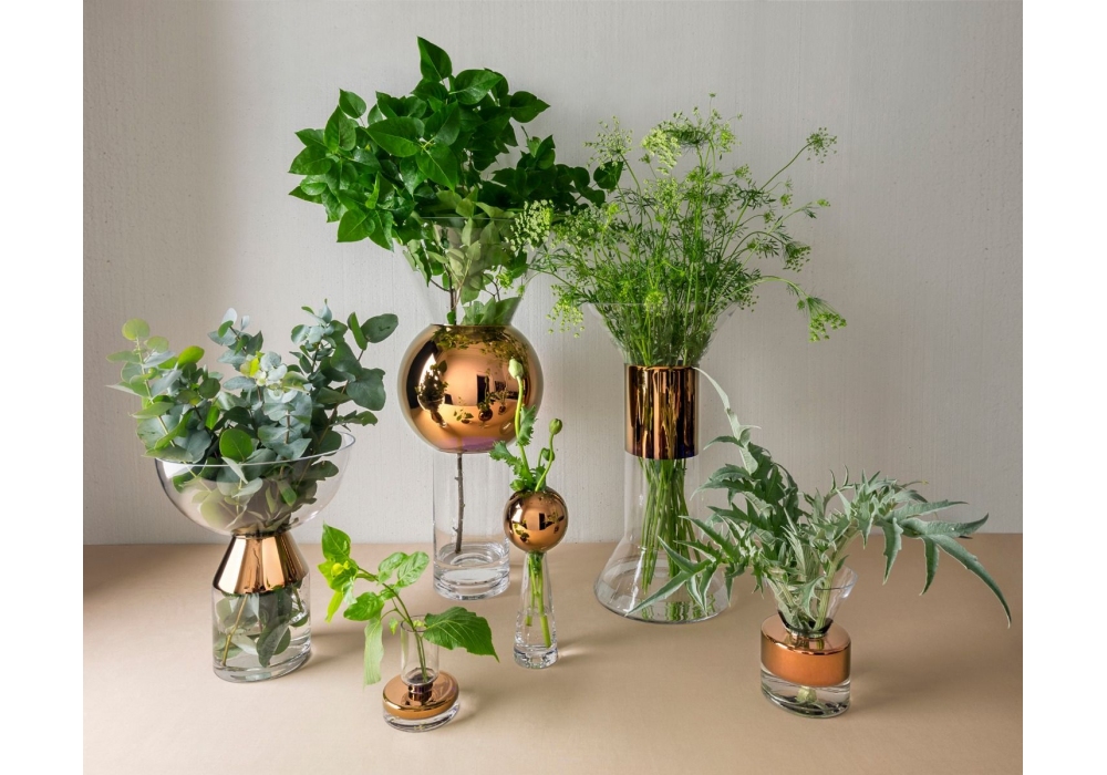 Tank Large conçu par Tom Dixon est un vase en verre soufflé transparent décoré de détails en cuivre.