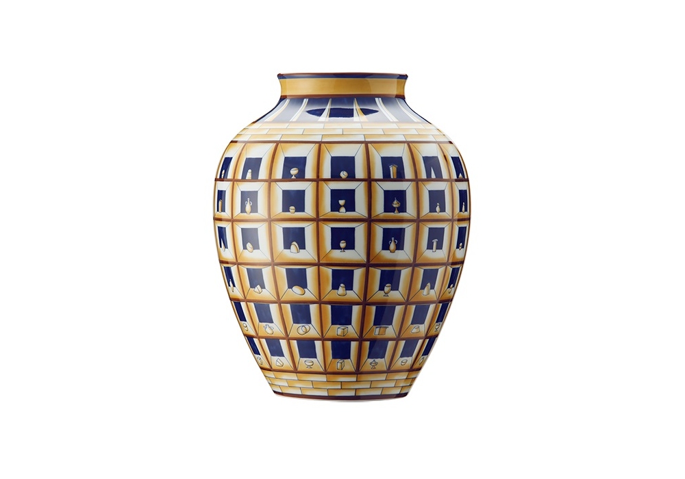 Vaso ad Orcino Gio Ponti, Prospettica conçu par Gio Ponti pour Ginori 1735 est un vase décoré en porcelaine avec un effet illusionniste du relief et avec la décoration étudiée en décalcomanie.