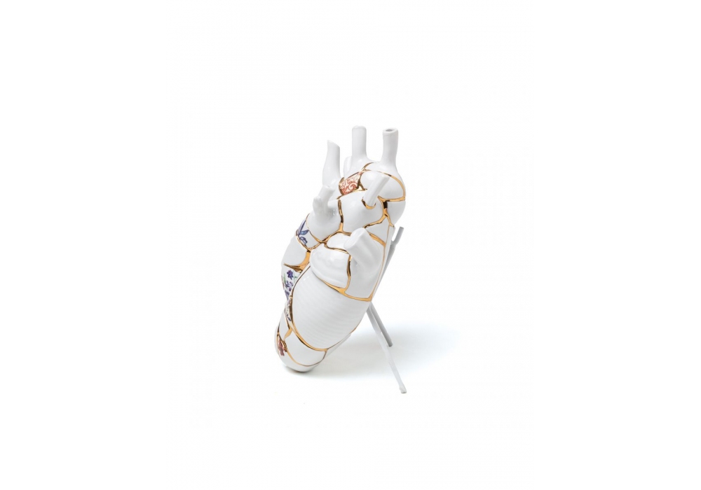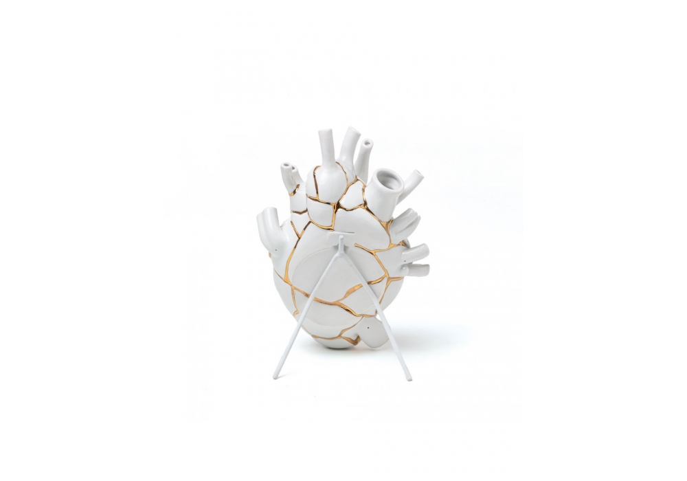 Love in Bloom Kintsugi conçu par Marcantonio pour Seletti est un vase en porcelaine blanche avec des détails dorés qui représente l'anatomie d'un cœur humain décoré de motifs floraux.
