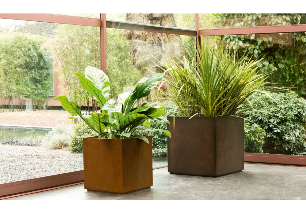 Cube conçu par R&D De Castelli pour DeCastelli est un pot de fleurs en métal, complet avec pot interne en plastique. Disponible en différentes finitions et tailles.