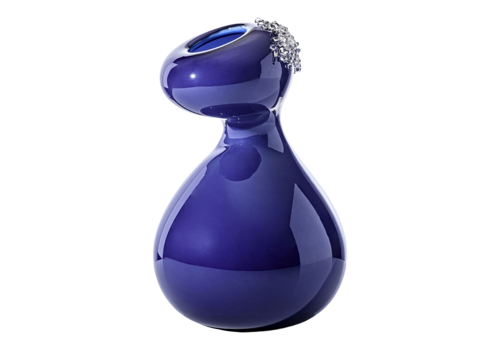 分子 Molecule conçu par Mantas Petruškevičius pour Venini est un vase en verre soufflé à la bouche de couleur indigo, avec des décorations florales appliquées à chaud. Édition numérotée par année.