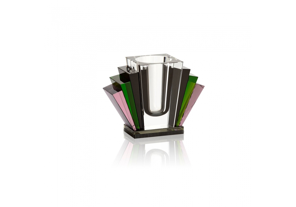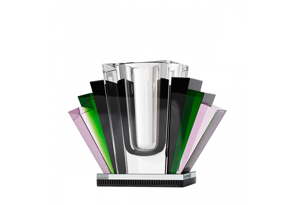 Harlem produit et signé par Reflections Copenhagen est un vase rectangulaire en cristal structuré par divers éléments sculptés et finis à la main en noir, rose, transparent et vert.