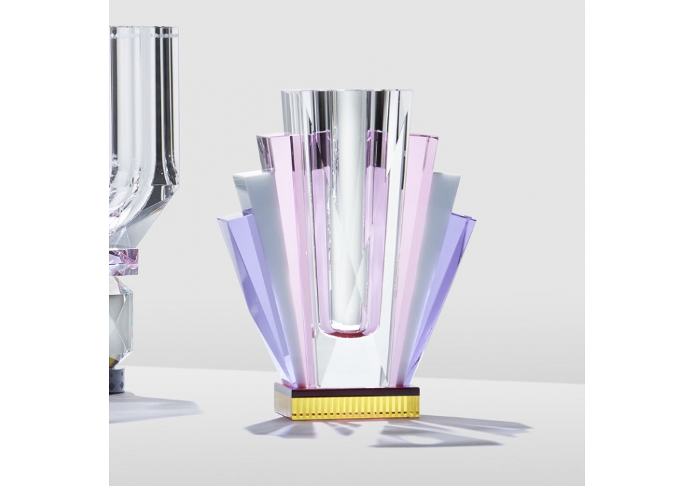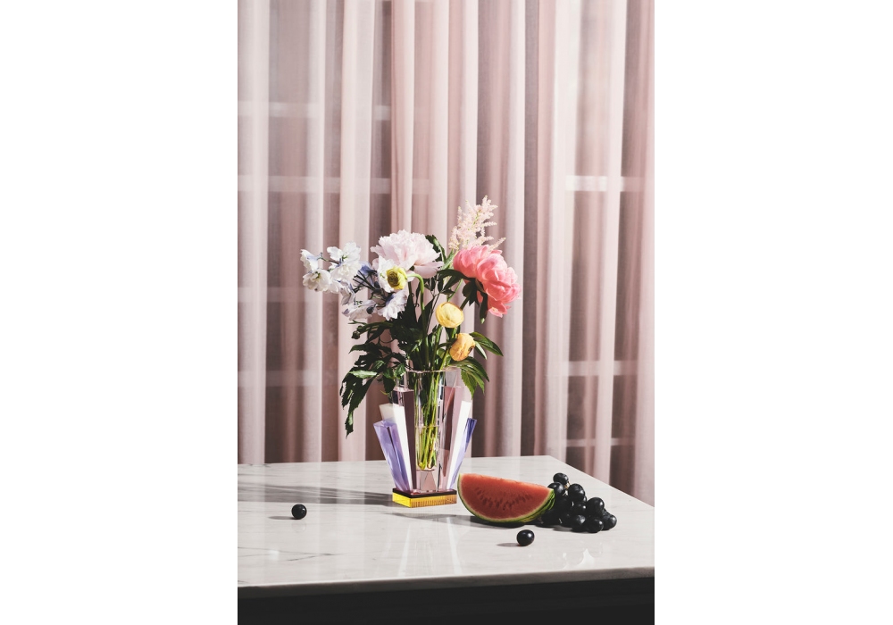 South Beach produit et conçu par Reflections Copenhagen est un vase en cristal quadrangulaire structuré par divers éléments sculptés et finis à la main en transparent, rose, blanc, violet et jaune.