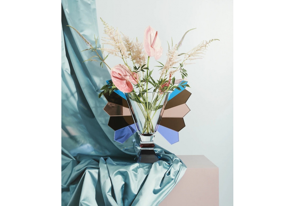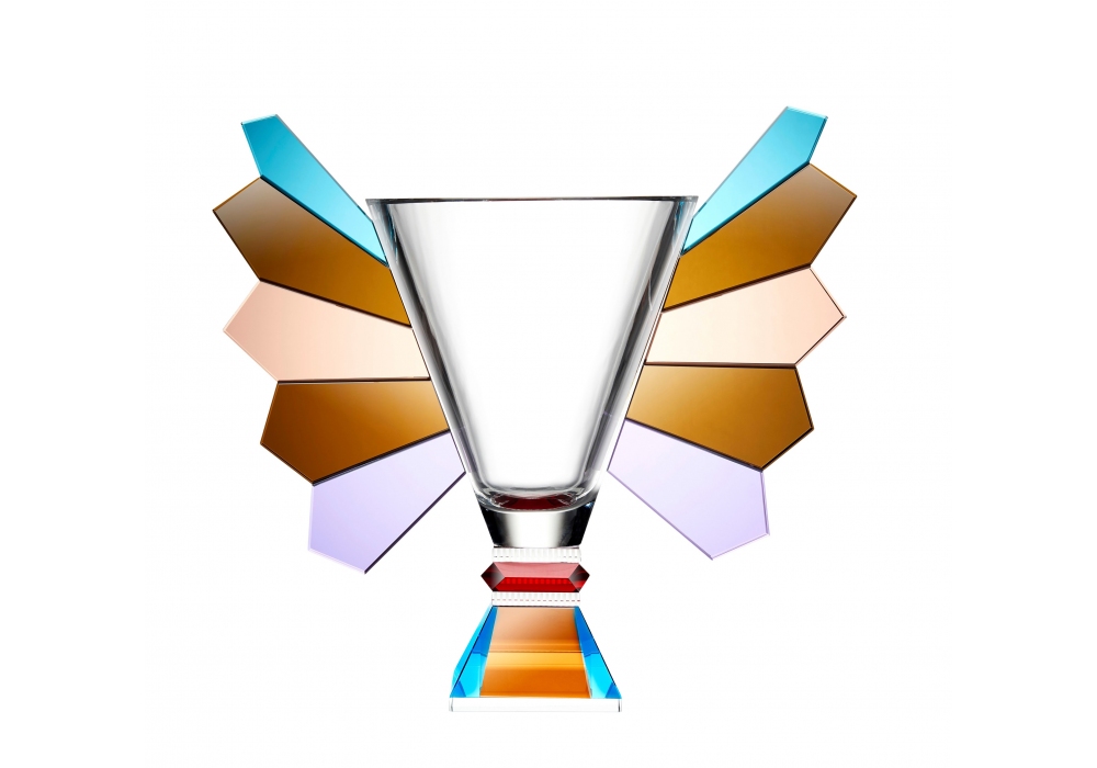 Amarillo produit et signé par Reflections Copenhagen est un vase en cristal en forme de gobelet structuré par divers éléments sculptés et finis à la main en transparent, rouge, marron, bleu et violet.