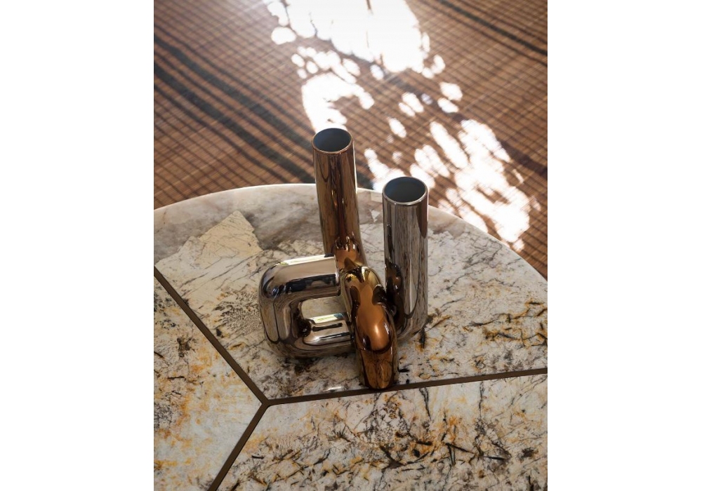 Pi-Dou conçu par Alvino Bagni pour Tacchini est un vase en céramique émaillée de couleur platine ou bronze. Disponible en deux versions, qui peuvent être achetées individuellement ou par paires.