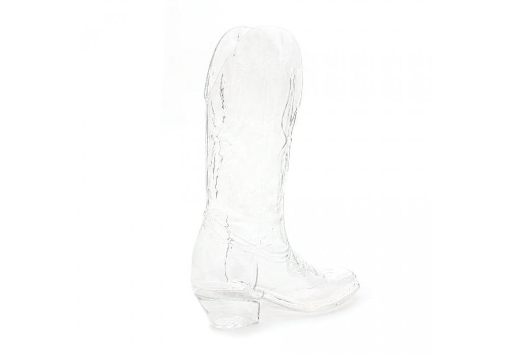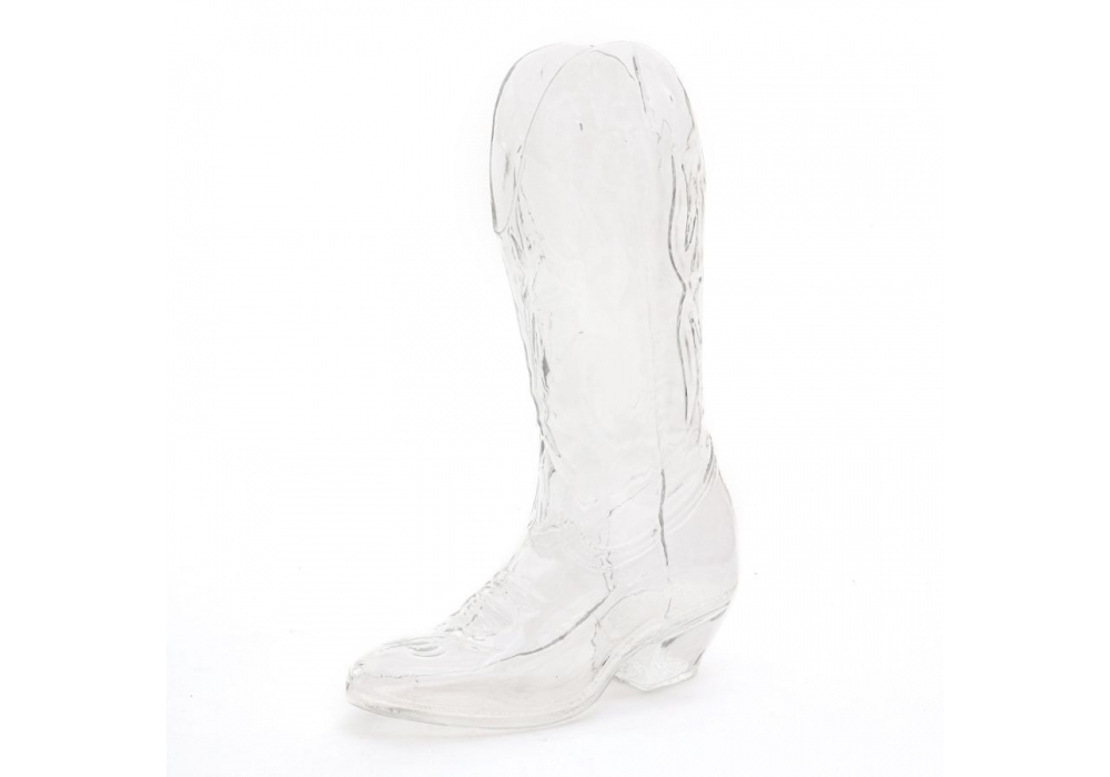 Crystalbootie conçu et produit par Seletti en collaboration avec Diesel Living est un vase en forme de botte de cow-girl en verre transparent.