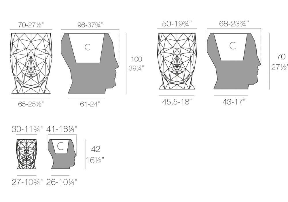| Dimensions | 30 x 41 x H 42 cm; 49 x 68 x H 70 cm; 70 x 96 x H 100 cm |