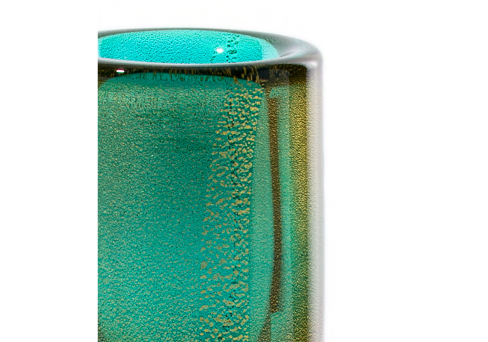 Cilindro Sommerso conçu par Peter Marino pour Venini est un vase en verre soufflé travaillé à la main, avec une finition nuancée de cristal transparent, vert paraïba et feuille d'or.