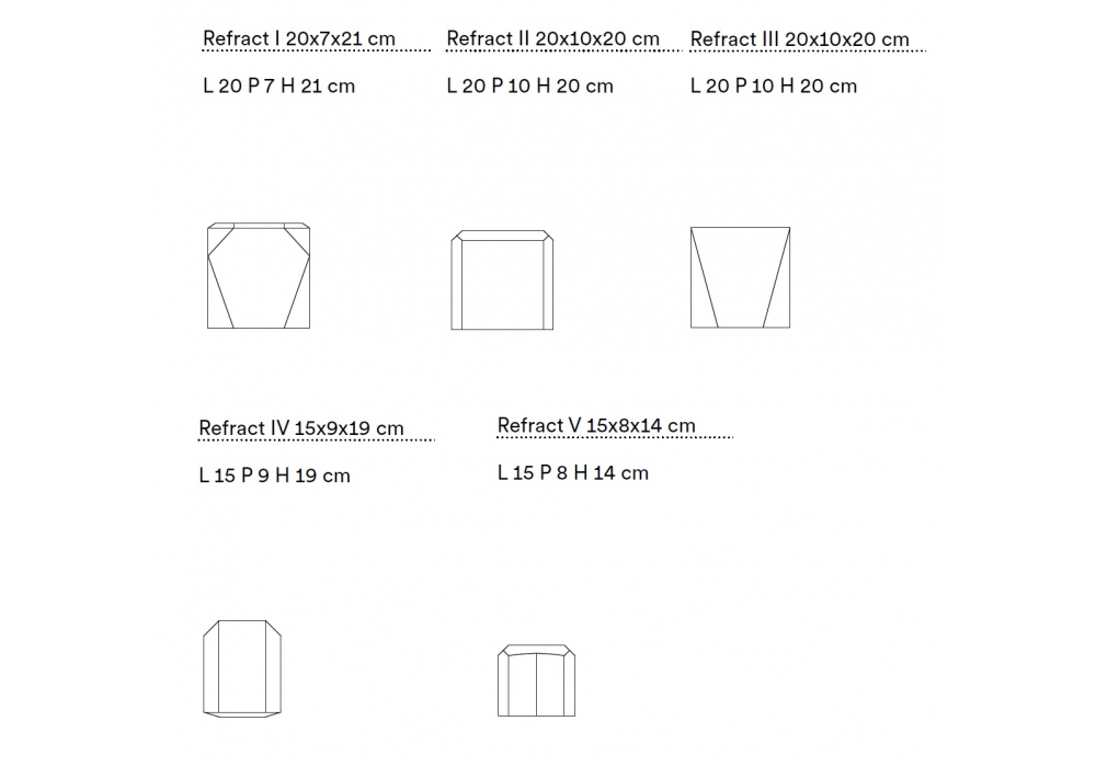 | Dimensions | Refract I_ 20 x 7 x H 21 cm; Refract II_ 20 x 10 x H 20 cm; Refract III_ 20 x 10 x H 20 cm; Refract IV_ 15 x 9 x H 19 cm; Refract V_ 15 x 8 x H 14 cm; |