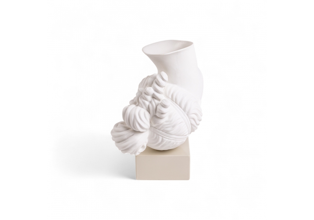 Amor Volat conçu par Marcantonio pour Seletti est un vase en porcelaine avec une base en plastique.