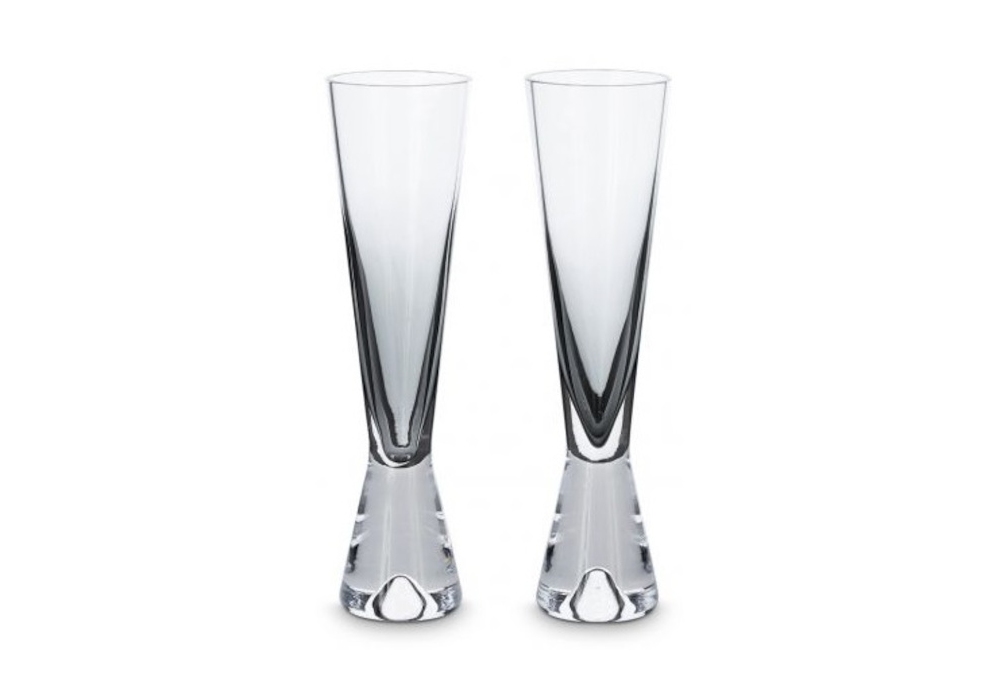 Tank Champagne conçu par Tom Dixon est un ensemble composé de deux coupes à champagne en verre soufflé avec des détails décorés à la main, disponibles en finition cuivre ou noire.