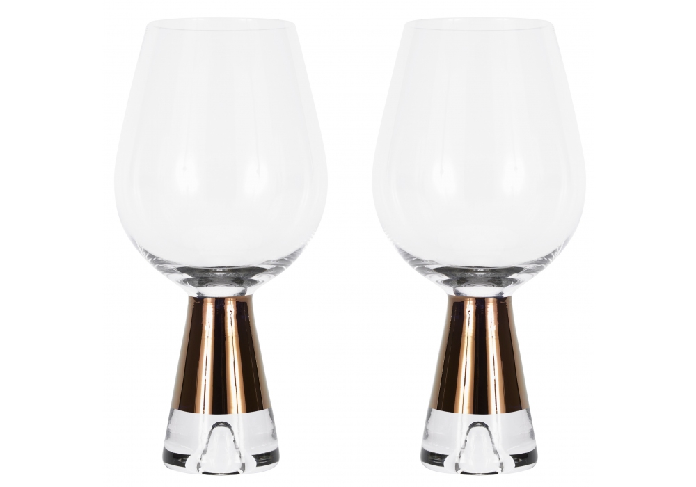 Tank Wine conçu par Tom Dixon est un ensemble composé de deux verres en verre soufflé décorés de détails disponibles en finition cuivre ou noire.
