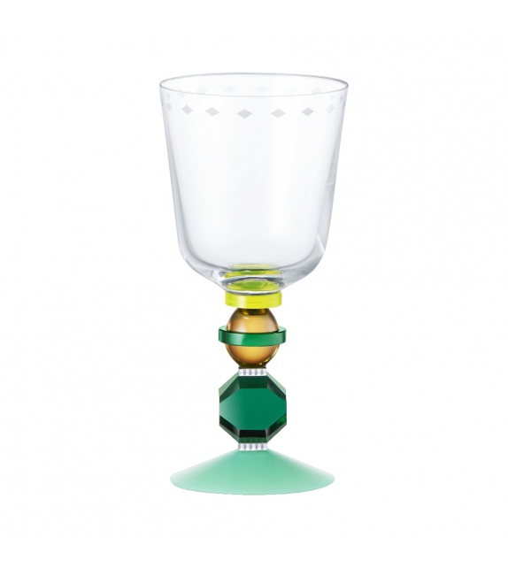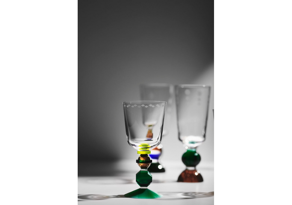 Mayfair Short produit et signé par Reflections Copenhagen est un verre à pied court en cristal transparent, émeraude, marron, menthe et jaune vif.