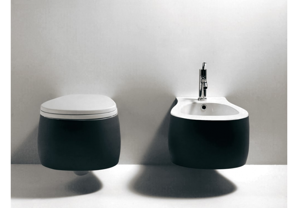 Pear conçue par Patricia Urquiola pour Agape est un WC suspendu sans bride en céramique blanche ou bicolore. Siège en polyester avec fermeture douce et dégagement rapide.