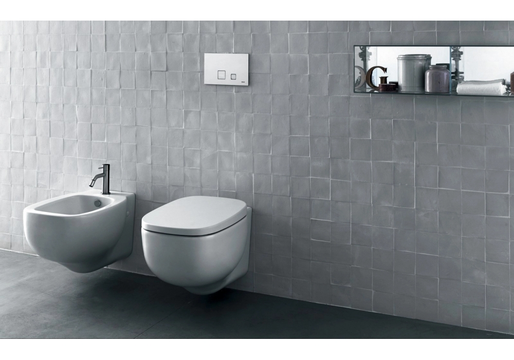 XY conçu par Piero Lissoni pour Boffi est un WC suspendu en céramique avec couvercle en résine d'urée.