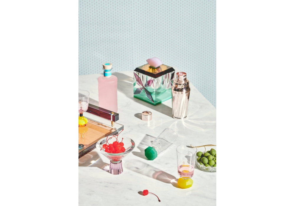 Wilson prodotto e firmato da Reflections Copenhagen è un portaghiaccio interamente strutturato in cristallo lavorato a mano di colore menta, trasparente e rosato.