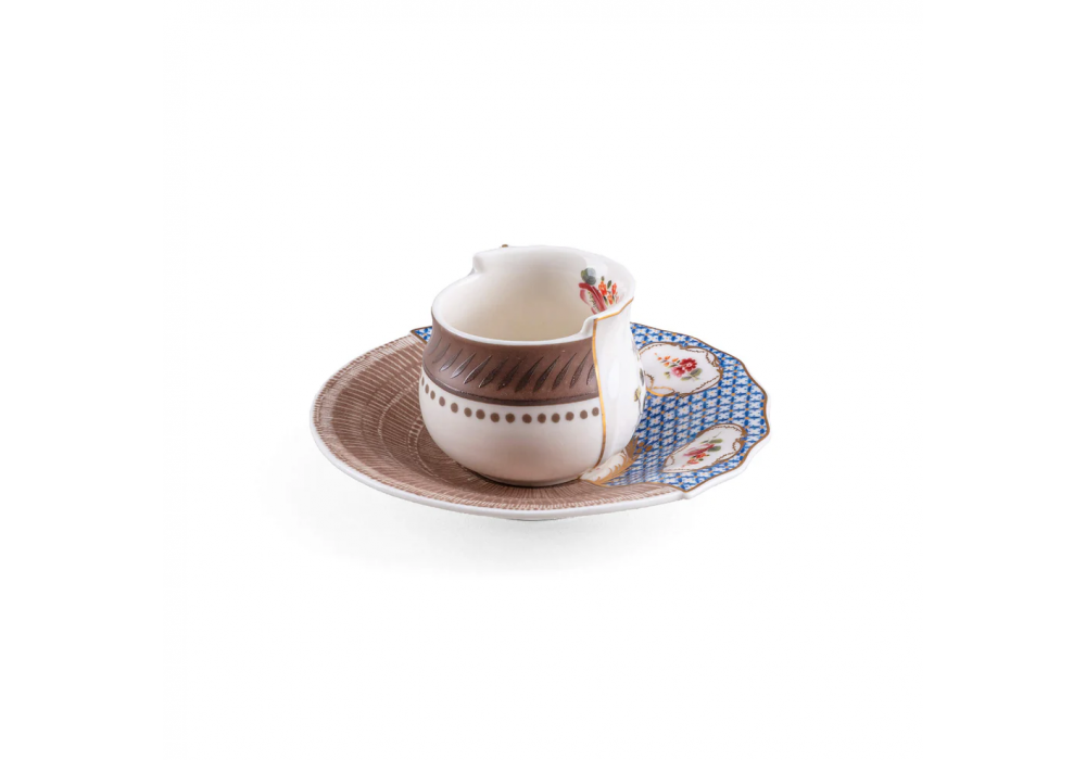 Hybrid Djenne firmata da Ctrl Zac per Seletti è una tazzina da caffè in porcellana con piattino decorata con diversi pigmenti e composizioni floreali.