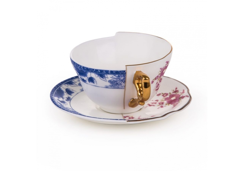 Hybrid Zenobia firmata da CTRLZAK per Seletti è una tazzina da thè con piattino in porcellana bianca con manico dorato. Il set è realizzato dal connubbio di due forme differenti con stampe colorate ai lati e sul piano del paittino.