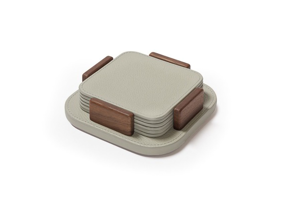 Tableware Collection firmati da Giobagnara per Poltrona Frau sono 6 sottobicchieri di forma quadrangolare con angoli arrotondati realizzati in Pelle Frau®. Il porta sottobicchieri è in legno con particolari in legno noce rivestito in Pelle Frau®.