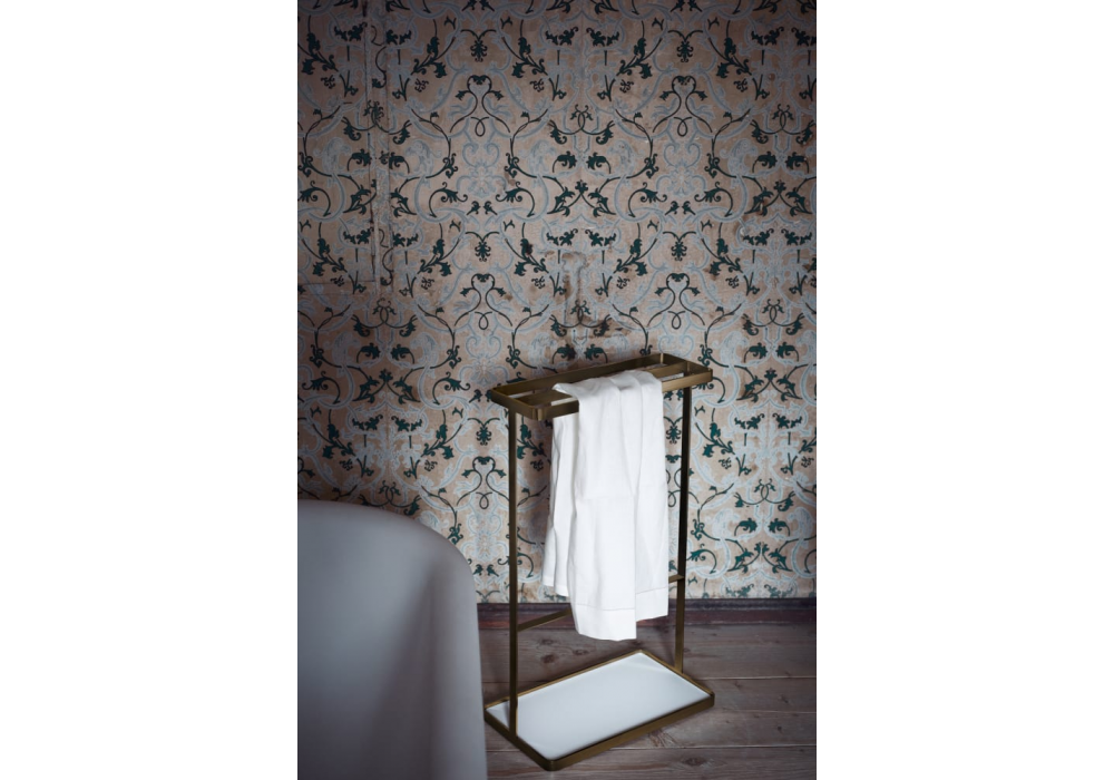 Memory firmato da Benedini Associati per Agape è un porta salviette da terra con struttura in acciaio inox in diverse finiture e base in marmo o Cristalplant® bianco.