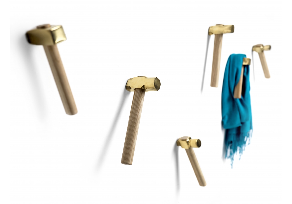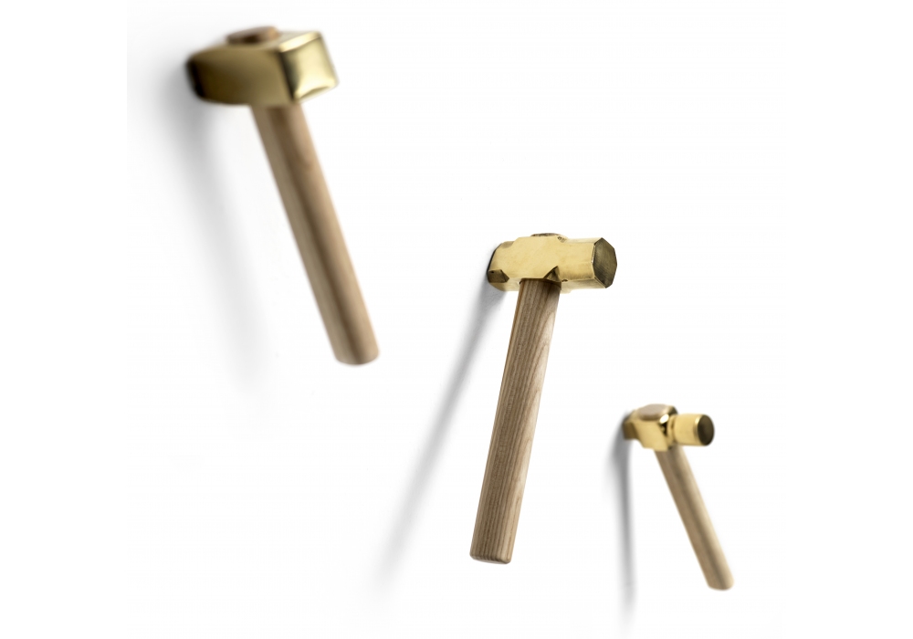 Bastaaa firmato da Marcantonio per Mogg è un kit di 3 martelli appendiabiti con manico in frassino olivato naturale e puntale in fusione di ottone in finitura satinata opaca.