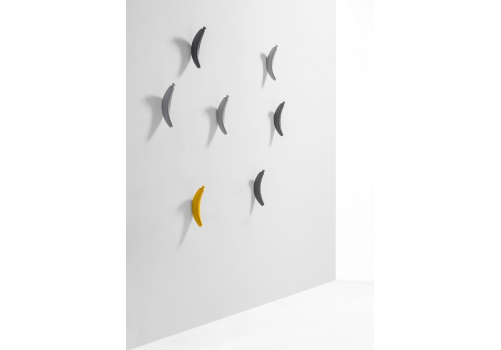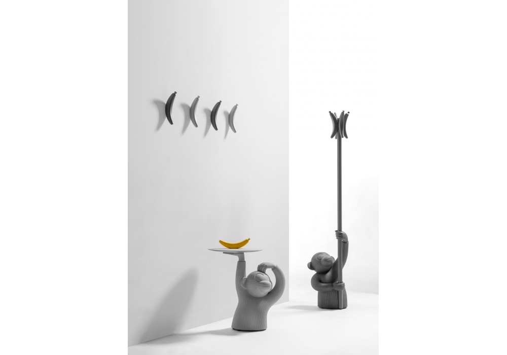 Monkey firmato da Jaime Hayon per BD Barcelona è un appendiabiti la base è in cemento, il palo e la banana in massello di frassino, è disponibile in nero o grigio.