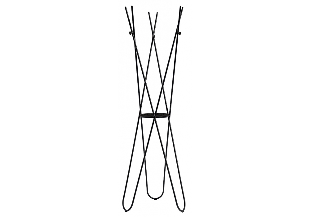 Wdrobe firmato da RSW per Discipline è un appendiabiti con struttura e accessori in metallo curvato nero goffrato.
