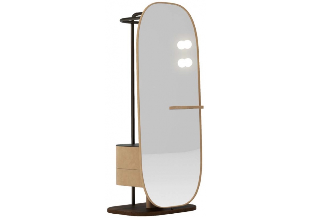 Weekend firmato da Federico Peri per Baxter est un servomuto con struttura in tubolare di metallo brunito. Cornice, ripiano e retro specchiera rivestiti in pelle. Cassettiera rivestita in pelle con piano in metallo brunito. Struttura vano cassetto e base in rovere spazzolato tinto in diverse tonalità.